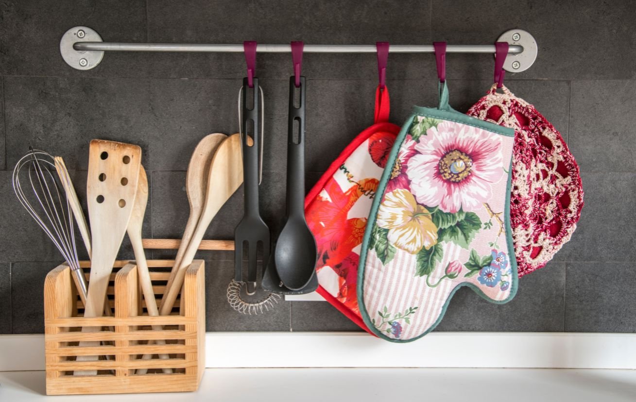 If you’re short on drawer space, a tension rod can be a great way to hang dish towels or oven mitts. This not only helps keep your tools organized but also adds a decorative touch to your kitchen.