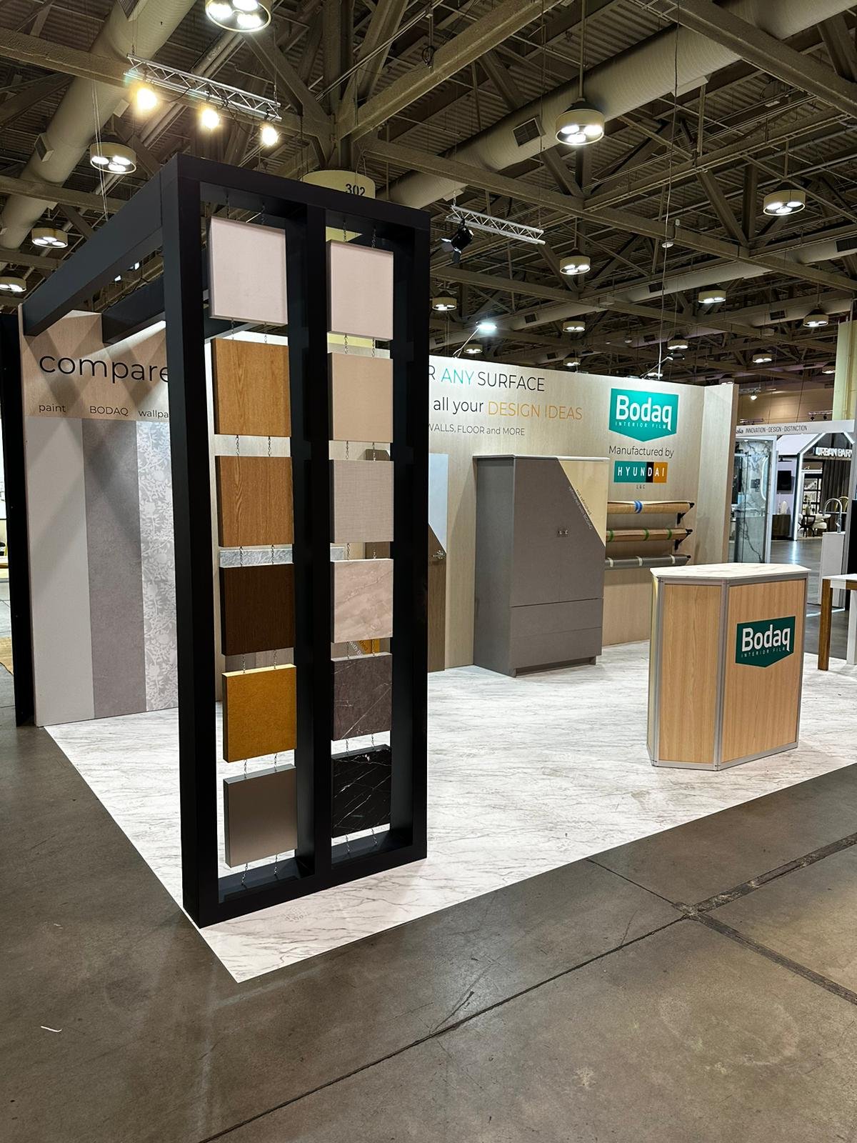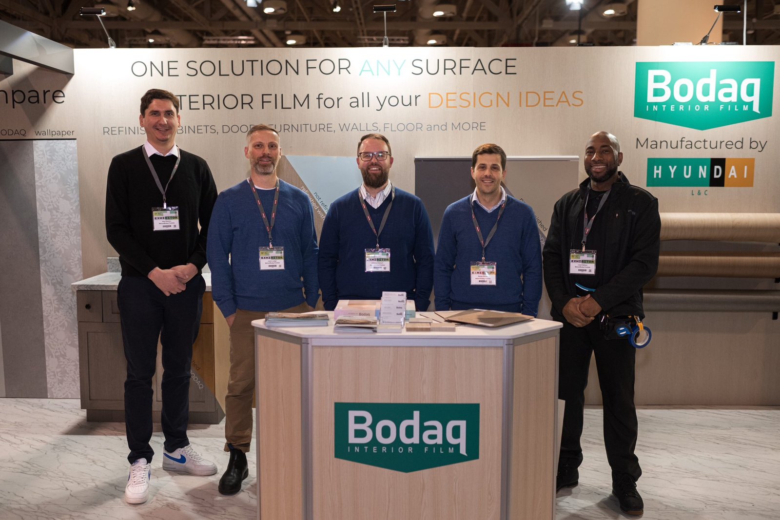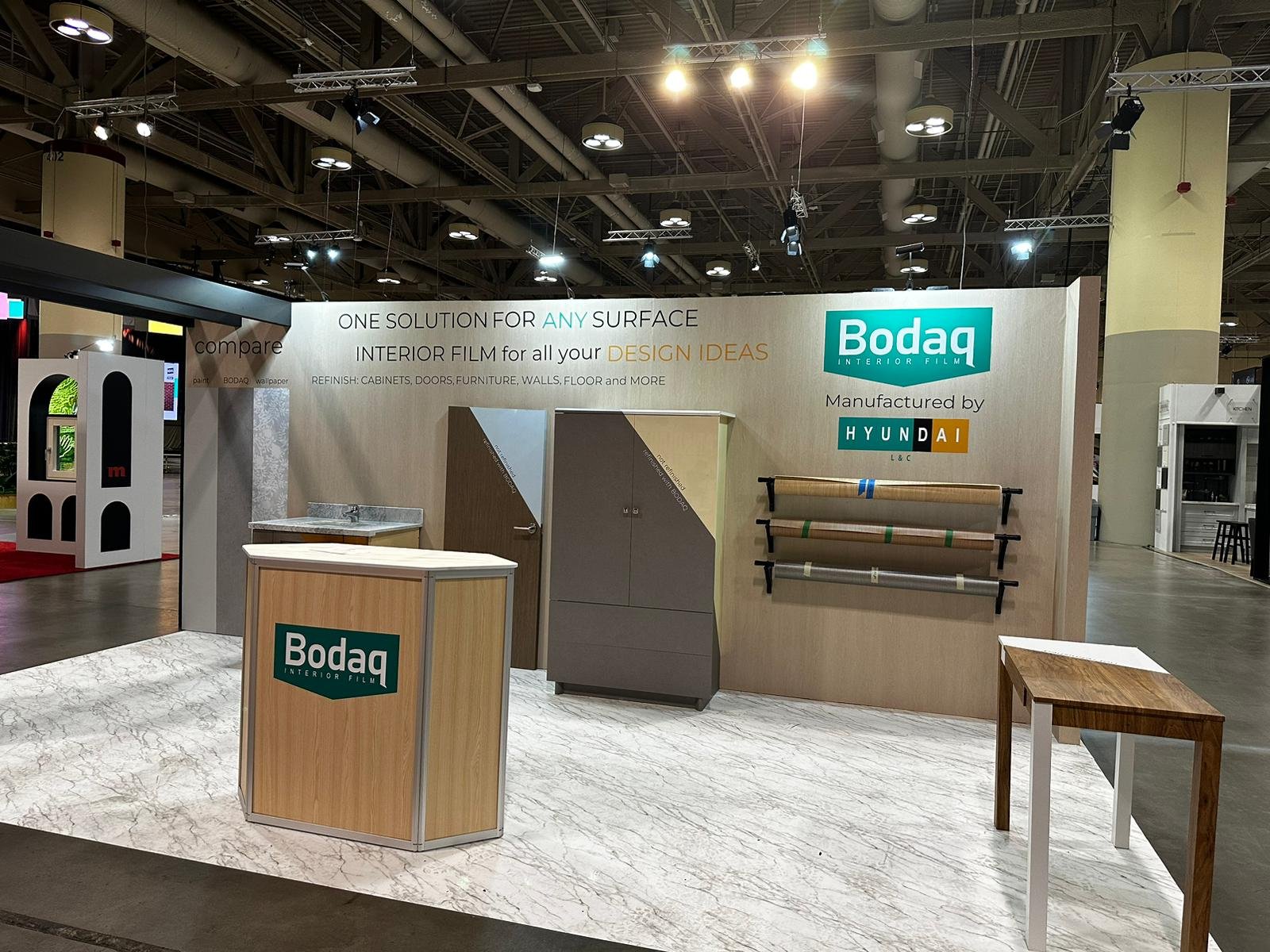 If you are curious about how the Bodaq booth looked, take a look at the photos below. We were happy to showcase different film patterns and a variety of surfaces they can be applied to. We also had our traditional scratch area where everybody could try to damage three types of surfaces – wallpaper, paint, and interior film.