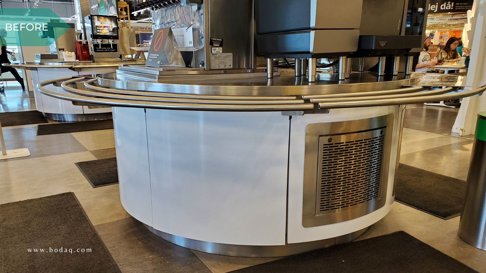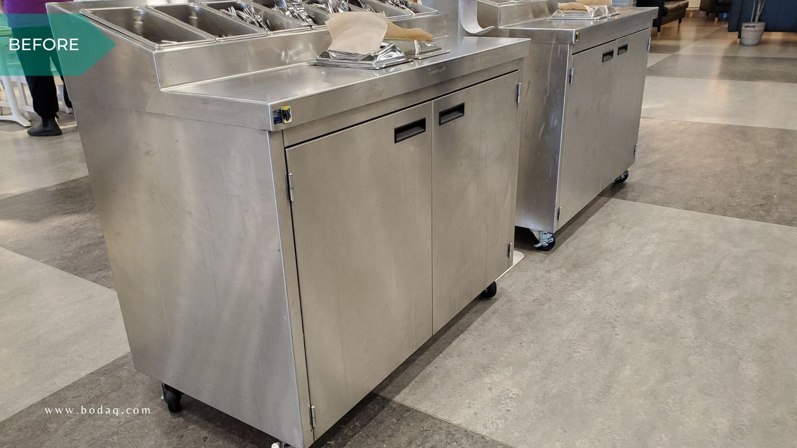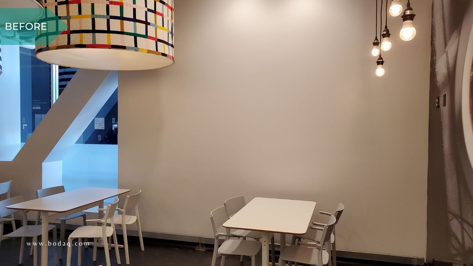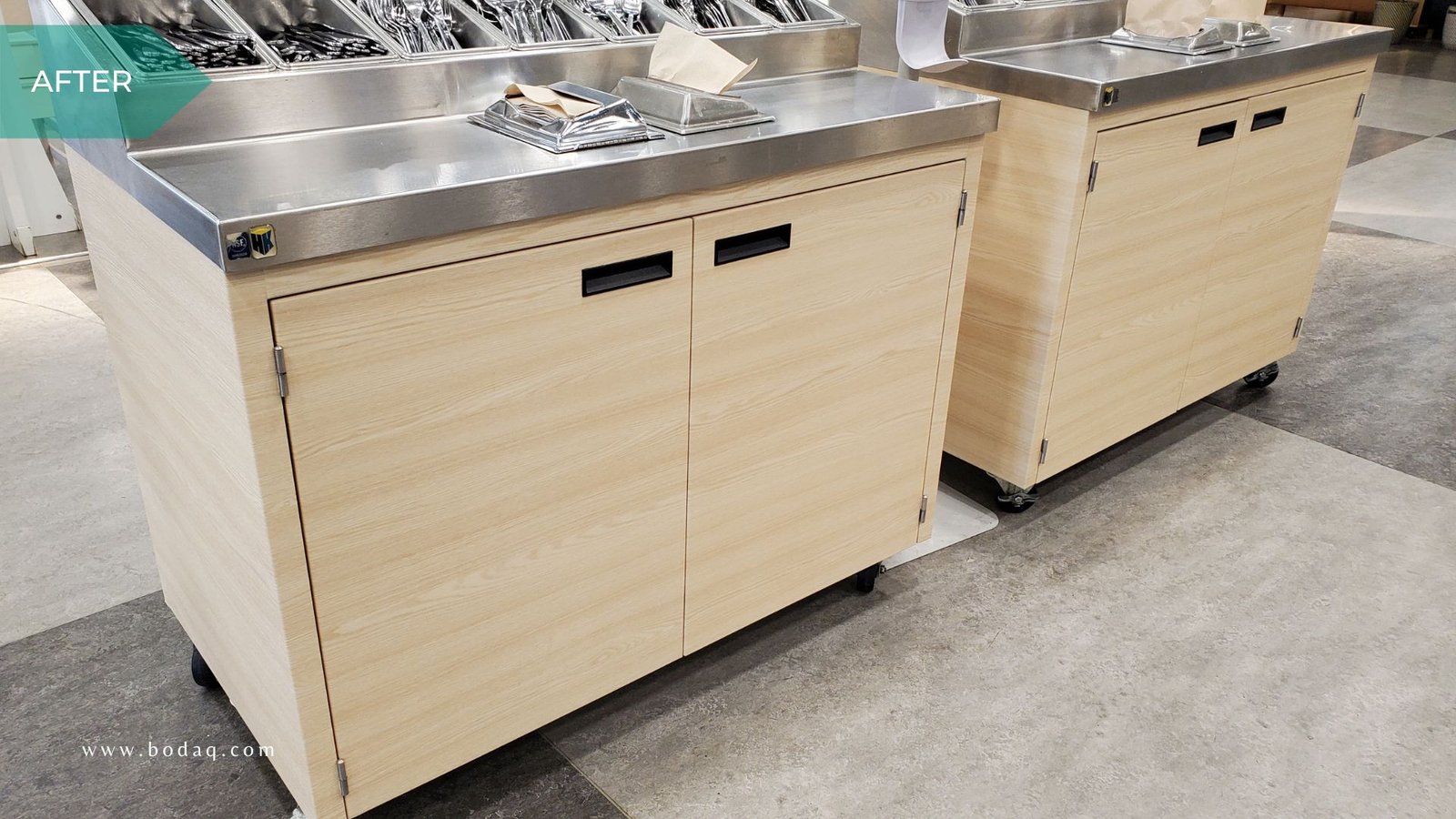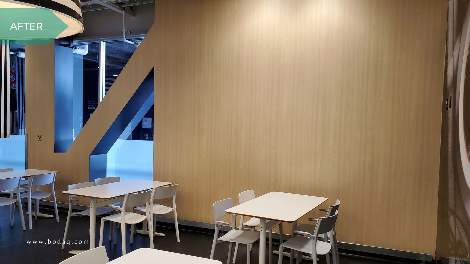 Bodaq was selected to replace traditional paint due to its superior durability and resemblance to natural materials like wood, stone, metal, and leather in one of the large furniture stores. The store needed a solution to withstand high foot traffic in the cafeteria while retaining its aesthetic charm. The walls, the self-serve station, the coffee bar, and the cutlery/condiments stands were all refinished with W389 Ash from the Wood Collection. The subtle, natural wood grain finish gave the space a modern yet cozy feel, elevating the overall ambiance.