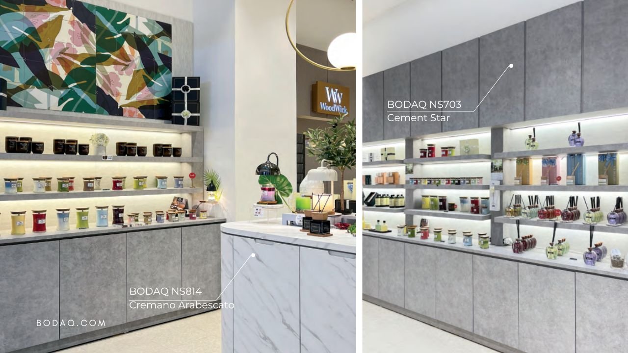 At the WoodWick candles store, Bodaq Interior Film was used to achieve a sophisticated union of NS814 Cremano Arabescato white marble with gray veining and NS703 Cement Star, creating a timeless and elegant backdrop for their candle displays.