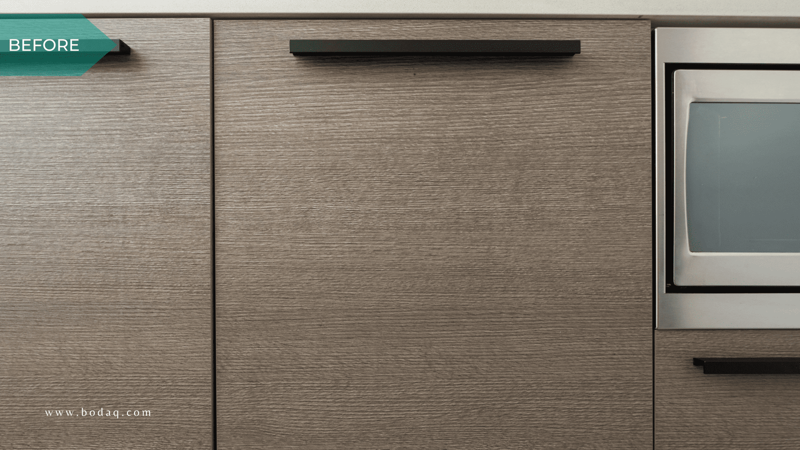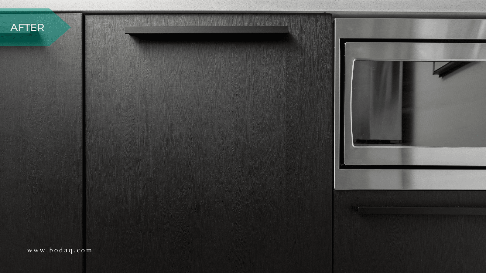He swapped a chocolate brown tone for a matte black, wood-textured finish available from Bodaq Interior Film, distribute by Nelcos, available in an extensive range of textures and patterns.