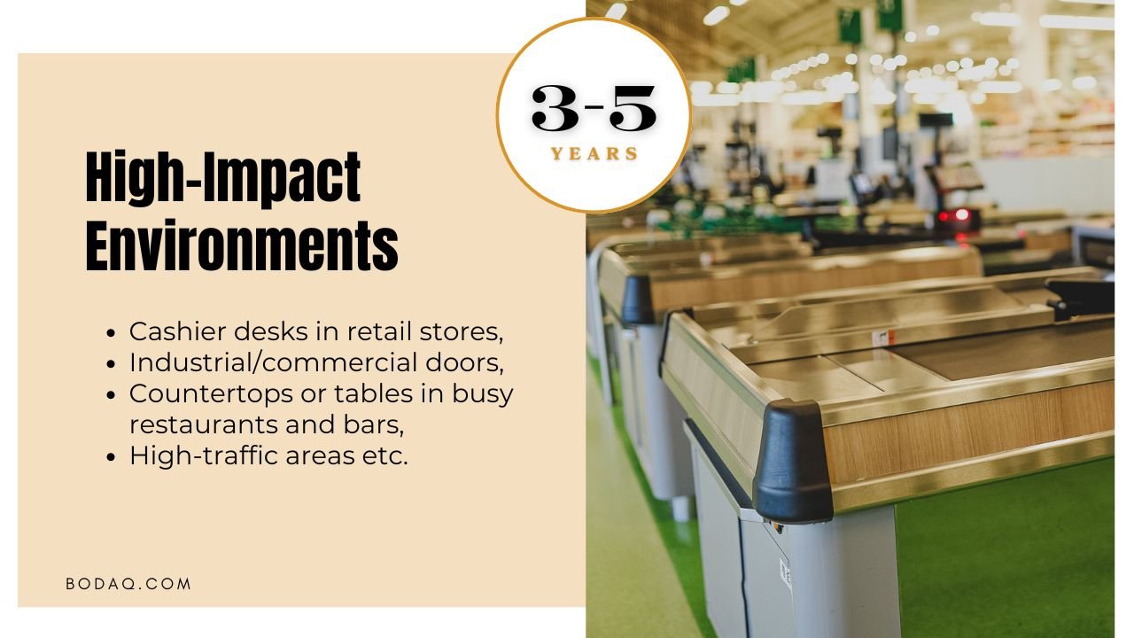 Medium-impact environments include areas where surfaces are in constant contact with people. Examples include kitchen countertops, residential cabinets, frequently used doors in apartment and office buildings, wall panels in high-traffic areas, and desks or other furniture.